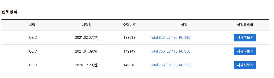 일단 나는 작년 12월부터 3개월간 총 3차례의 토익시험을 봤고, 이러한 성적을 기록했다.