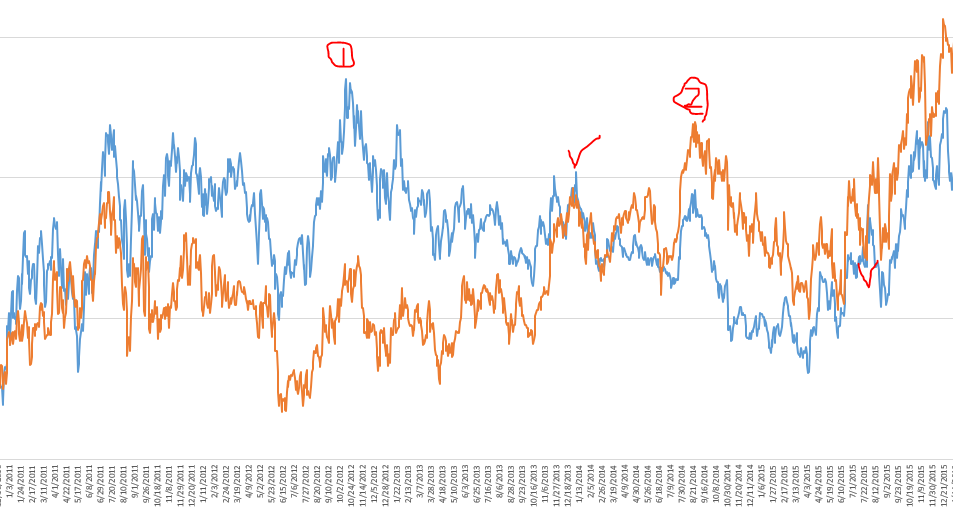2011년부터 2015년까지의 정규화가격 그래프를 확대해봤다. 마찬가지로 파란색이 현대해상, 주황색이 DB손해보험이다. 이 케이스에서 베스트 시나리오라고 한다면 내가 터치패드로 꾸물꾸물 구려놓은 1번 시점에서 현대해상을 매도, DB손해보험을 매수하고 다음에 오는 체크포인트(정규화 가격 그래프가 겹치는 시점)에서 청산을 한 뒤에 2번 시점에서는 DB손해보험을 매도, 현대해상을 매수한 뒤에 다음 체크포인트에서 청산하면 된다.