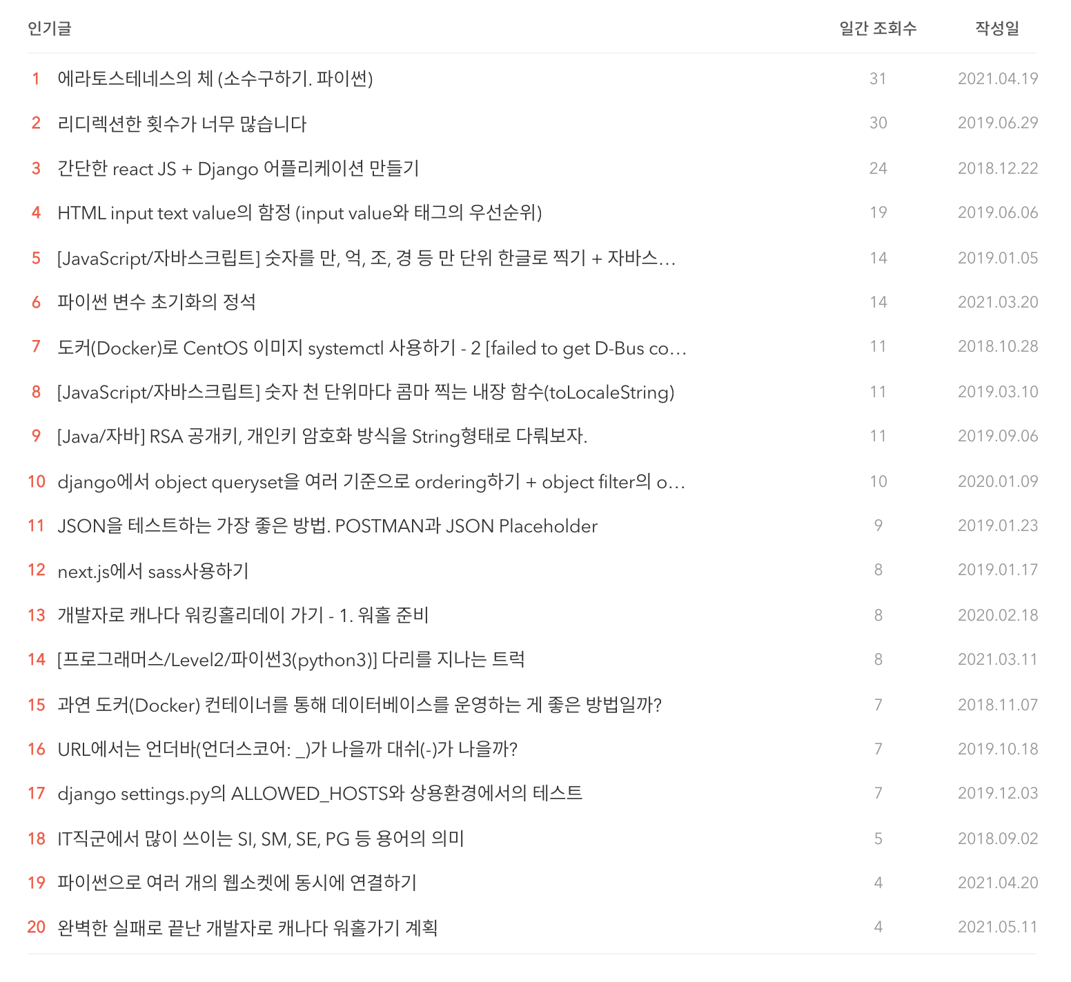 여느때와 다름 없는 비슷한 조회수와 순위이지만 다른 게 하나 있다면 에라토스테네스의 체라는 게시물은 평소엔 조회수 순위에서 볼 수 없는 친구다. 그것 때문에 오늘 투데이가 많이 뛴 것 같다.