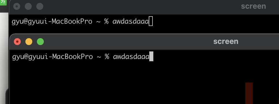 screen -x 명령어를 통해 같은 터미널에 접속한 모습. 한쪽에 명령어를 써도 자동으로 싱크가 된다.