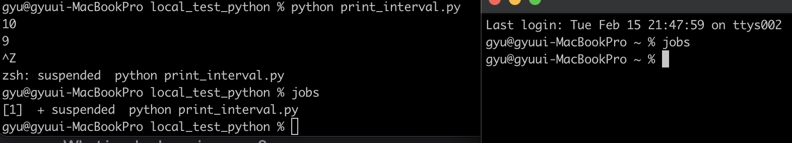 중간에 ctrl + z로 종료하고 jobs명령어로 조회한 결과 suspended된 print_interval.py 프로세스를 확인할 수 있다. 여기에서 분기가 갈리는데 fg % 1을 하면 해당 숫자의 job을 다시 포어그라운드로 실행시키고 bg % 1을 하면 해당 숫자의 잡을 다시 백그라운드로 실행시킨다. 이 글의 주제는 백그라운드이니 bg % 1을 하면 해당 작업이 백그라운드에서 진행된다.