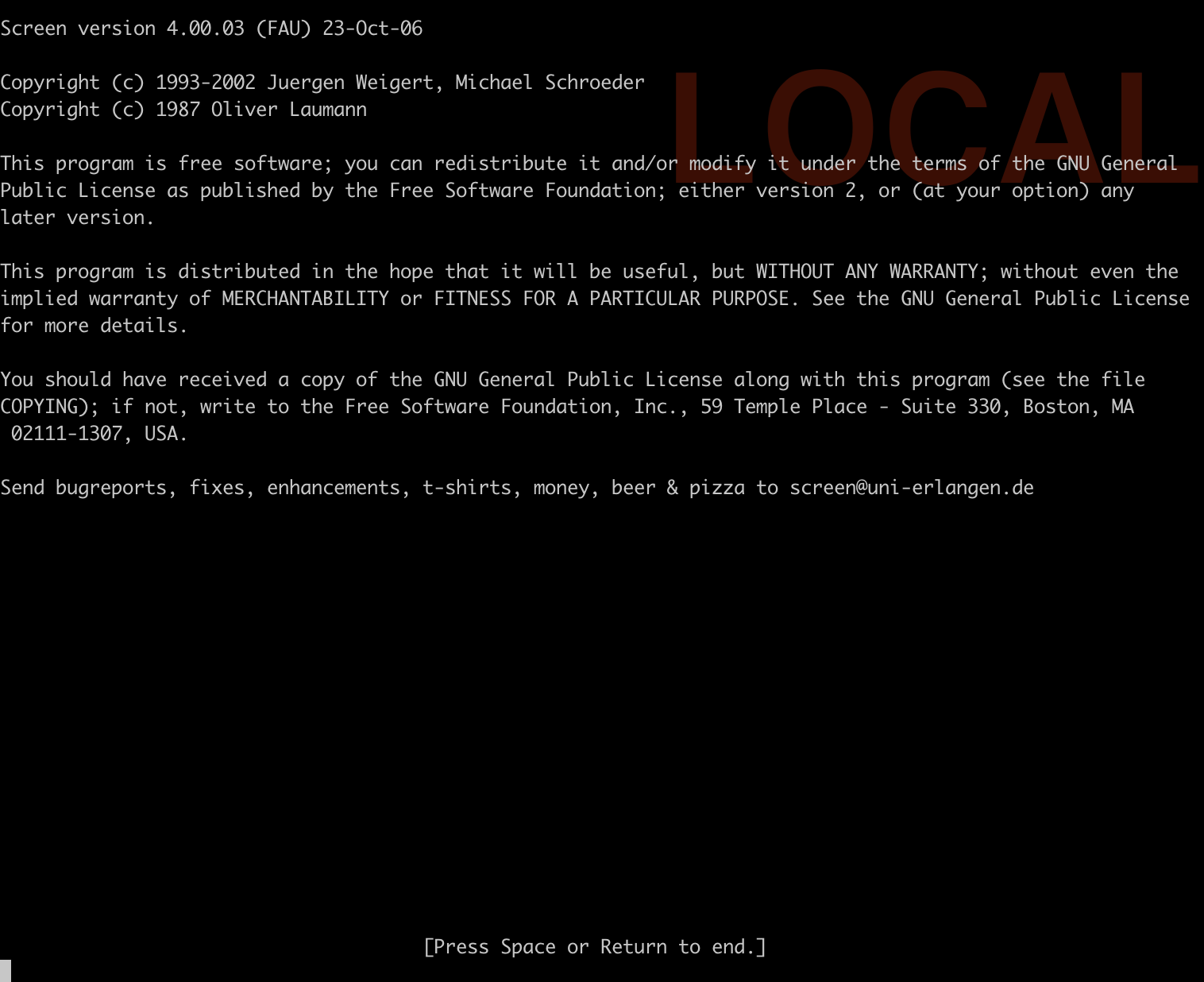 그럼 이런 창이 뜨면서 실행된다. enter를 누르면 공허한 터미널이 반겨준다. 터미널에서 나가는 방법은 ctrl + a, d이다. ctrl과 a와 d를 동시에 누르는 게 아니라 ctrl + a를 누르면 명령어를 입력하는 상태가 되는 것이고 거기에서 d를 누르면 screen으로부터 detach되는 것이다.