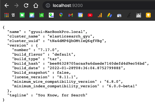 curl -X GET localhost:9200명령어를 통해 정상작동을 확인한다. 당연한 얘기지만 인터넷 브라우저를 키고 해당 포트로 접속해봐도 된다. elasticsearch가 실행되는 데에도 시간이 좀 걸리니 바로 안뜬다고 씅내지말고 조금 기다려보는 인내를 가져보자.