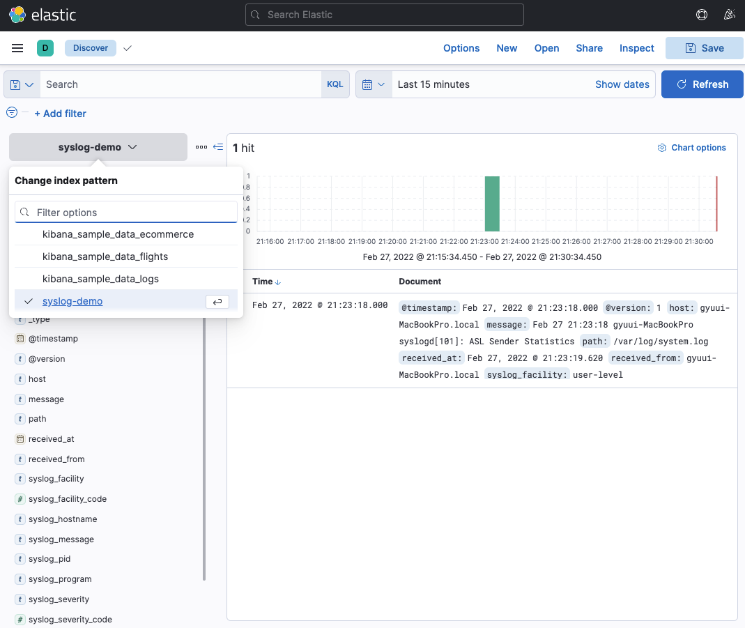 mune -> analytics -> Discover에서 좌측 상단에 syslog-demo라는 새로운 선택지가 생긴 걸 확인할 수 있을 것이다.