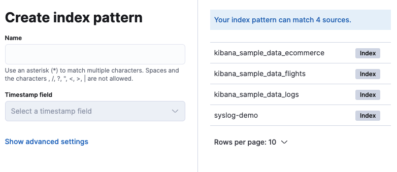 이렇게 syslog-demo라는 index로 수집되고 있는 데이터들을 확인할 수 있는데 name에 syslog-demo라고 입력한 뒤에(자동완성되는 와일드카드를 이용해도 된다) Timestamp field를 우리가 conf파일에서 설정했던 @timestamp로 맞추고 index pattern생성을 마치면