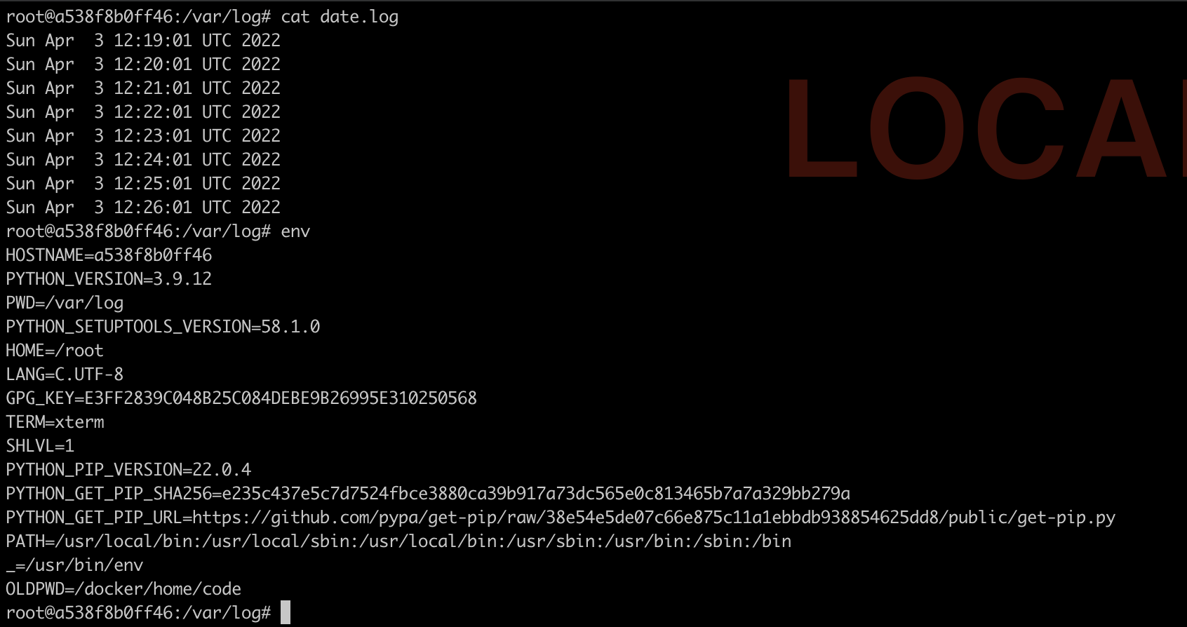 만약에 간단한 cronjob만 수행하는 conatiner를 작성해야 했다면 여기서 끝낼 수 있다. but cron의 재미있는 특징이 있는데 바로 환경변수를 제대로 인식하지 못한다는 점이다. 보통 개발할 때 개발환경과 staging, production환경의 구분은 환경변수로 하기 때문에 크론잡이 환경변수를 읽어야할 경우과 왕왕 필요한데 이런 특징 때문에 골치가 아프다. 당장에 지금 만들어본 컨테이너 내부에서 테스트해보자. env라는 명령어를 터미널에서 쳐보면