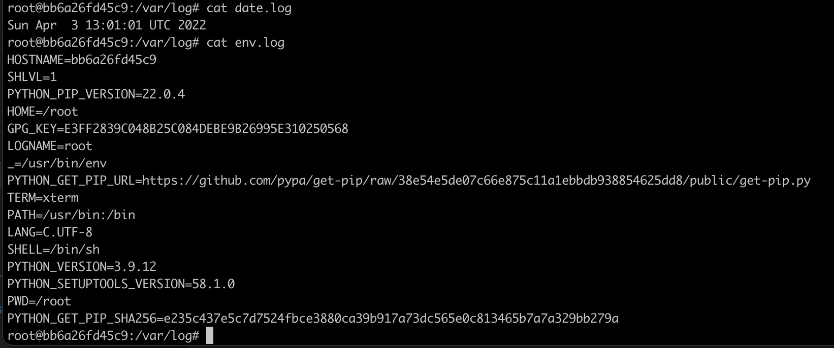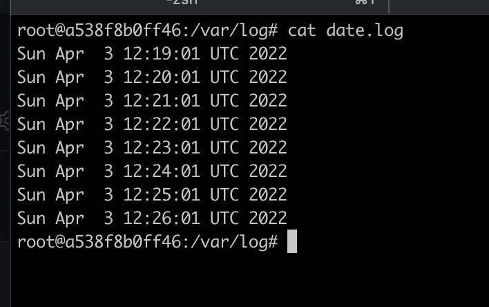 이렇게 두 파일을 작성하고 docker build를 해보면 위 동작이 입력된 cronjob과 함께 docker image가 완성된다. docker hub에 등록해놓았으니 docker pull jujumilk3/python-cron명령어로도 이미지를 받을 수 있다. 내 dockerfile 깃 저장소에서도 확인할 수 있다. 아무튼 이렇게 작성하고 해당 이미지로 컨테이너를 실행해보면 위에 지정한 /var/log/date.log 파일에서 기록된 값들을 확인할 수 있다.