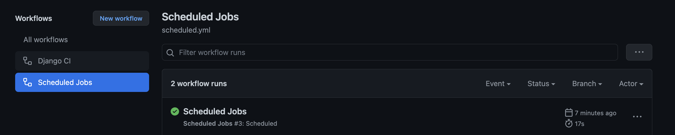 알다시피 github actions에는 PR이나 push등의 이벤트에만 작동하는 것이 아닌, 일정 시간마다 작동하는 workflow또한 작성할 수 있다. 진짜 간단한 scheduled.yml을 작성해보자. 아, 모든 과정은 내가 인프라 공부할 때 사용하는 https://github.com/jujumilk3/infra-study 이 레포지토리에서 진행할 것이니 행여 나중에 진행과정을 참고할 사람이 있다면 해당 저장소의 커밋 내역을 따라가보면 될 것이다. 그리고 Actions칸에 있는 수많은 실패내역도 그대로 둘 터이니 반면교사로 참고할 사람은 참고하면 될 것이다.