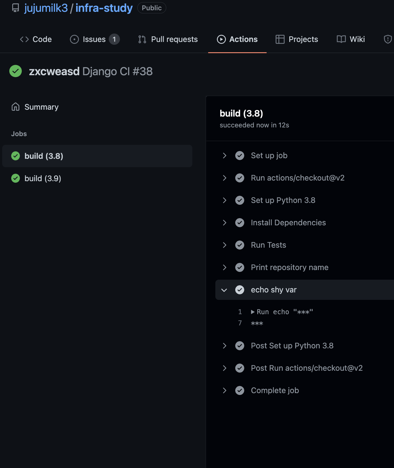아 그리고 추가로 github actions의 귀여운 점이 있다. 바로 secrets에 추가한 값이 노출되면 ***로 처리한다는 점이다. 만약에 actions secret에