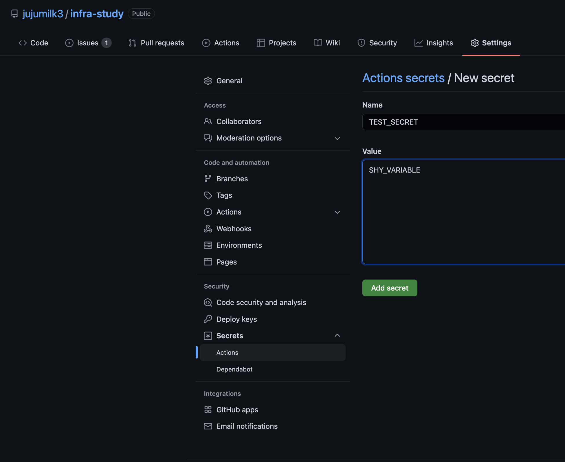이런식으로 secret을 추가한 뒤에 secret에 적혀있는 데이터를 사용해보려고 하면