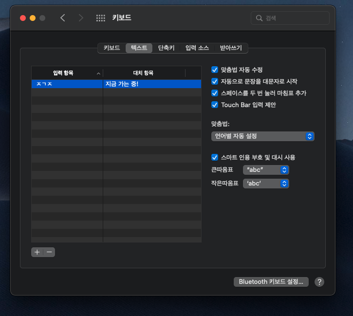 스페이스---와 Touch Bar---는 취향것 체크 or 해제하면 되겠지만 특히 무조건 해제해야하는 옵션이 바로 맨 밑이다. 가끔씩 stackoverflow나 기타 blog에 작성돼있는 코드를 복사 붙여넣기 할 때 키보드로 입력할 수 있는 따옴표가 아닌 뭔가 요상한 따옴표가 물려오는 경우가 있다. 바로 이 옵션을 킨 채 작성한 문서들이 그런경우다.