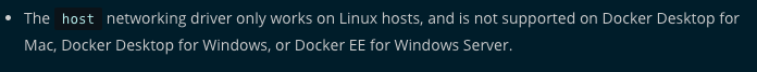 일반적인 개발환경(윈도우, 맥 등)에서는 host networking driver를 지원하지 않는다. 그러니 내가 위에 적어둔 과정(nginx container를 port mapping없이 접근하는 것)을 mac이나 windows에서 직접 재현해보려하지 않길 바라는 바이다. 나도 왜안되나 하다가 저걸 제일 나중에 읽었다. ㅠㅠ