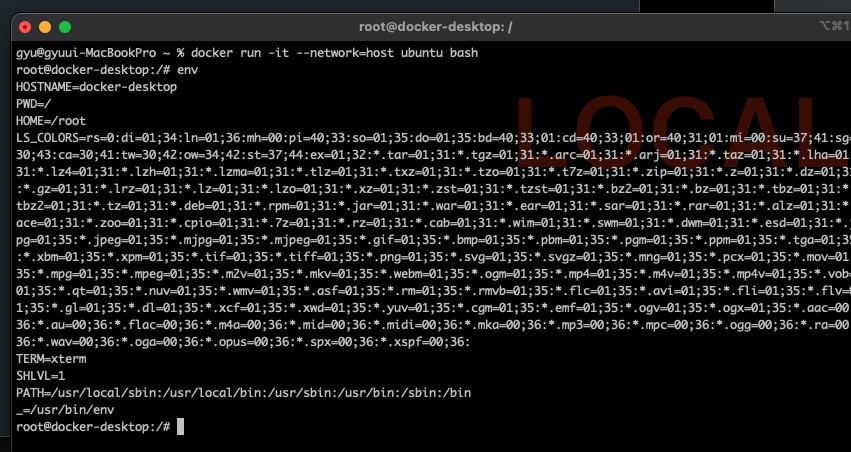 아무런 추가조작을 하지 않은 ubuntu container에서 env명령어를 쳤을 때 나오는 값들이다. localhost에서의 실행과 docker container로의 실행에 분기처리로 쓸 수 있을만한 값들은 안보인다. 그렇다고 .env파일을 제작해서 또 run할 때 --env-file=.env