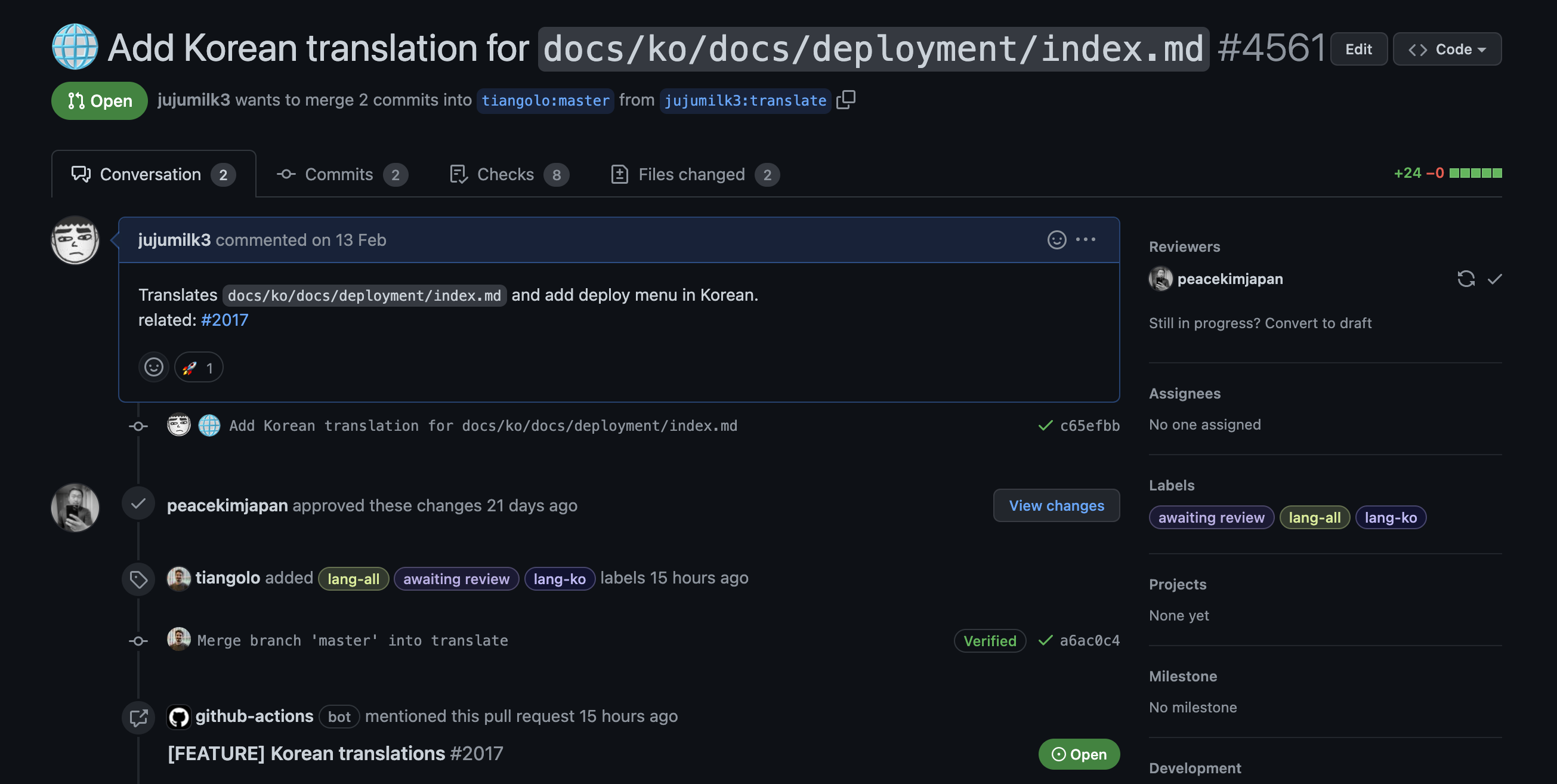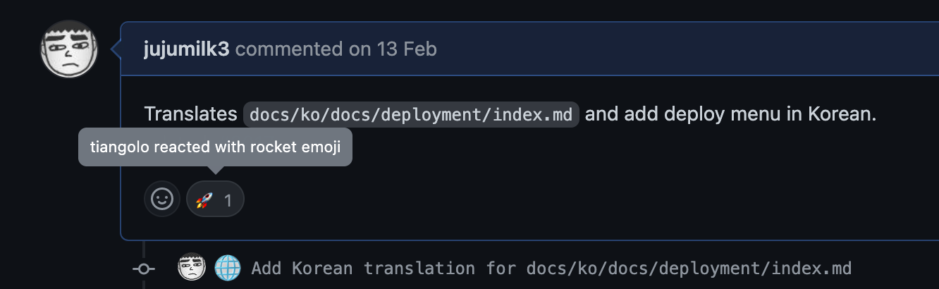 사실 위에 사진을 보면 알겠지만 아직 merge된 건 아니다(open상태). 들뜬 마음을 뒤로 하고 현재 tiangolo가 하고 있는 것을 보니 i18n에 대한 PR들을 전부 태깅해놓고 다음 버전에 한번에 같이 릴리즈시키려는 것 같다. 그때가 되면 또 다시 기념으로 포스트 하나 해야겠다.