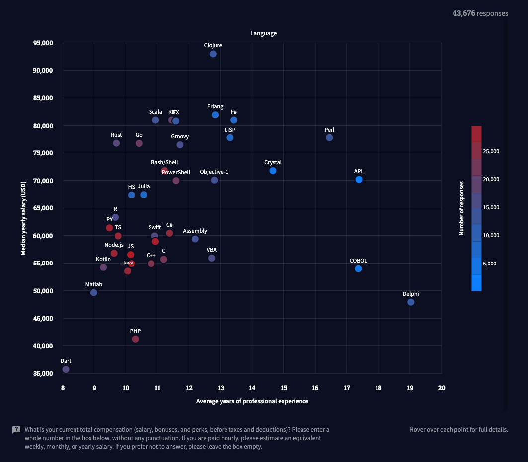 스칼라, Ruby, Ex(Elixir), Erlang, F#, LISP, Clojure가 뭉쳐있는 부분이 있는데 여기에서 Ruby만 제외하면 전부 함수형 언어이다. Clojure가 너무 상단에 위치해 있는데 몇몇의 아웃라이어가 적용된 것 같다. 뭐 아무튼 이걸 보면 같은 연차대비 다른 언어를 사용하고 있는 엔지니어들보다 훨씬 좋은 대우를 받고 있다는 것을 알 수 있다.