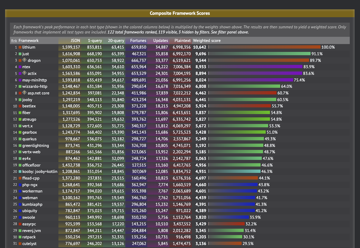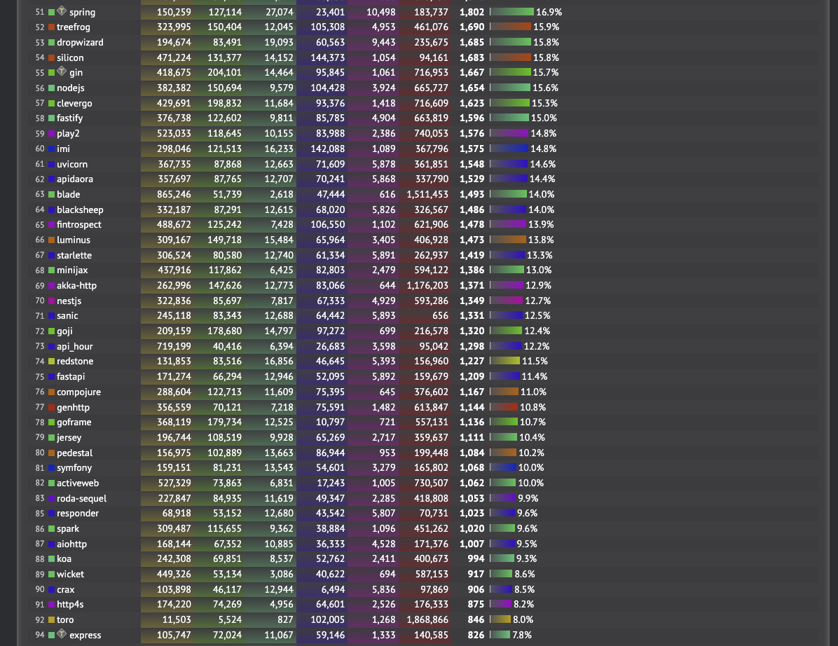 이 프레임워크들의 이름이 모두에게 익숙해야했을 것이다. 이 순위는 techempower에서 진행한 각종 프레임워크들의 성능을 비교시험하여 점수를 부여한 것이다.(https://www.techempower.com/benchmarks/#section=data-r20&hw=ph&test=composite)