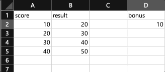간단한 엑셀을 작성해보았다. bonus의 값을 읽어서 score에 더해 result의 값이 변경된다.