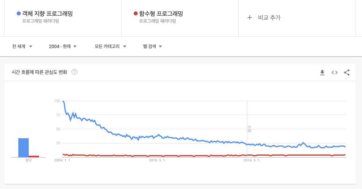 해보면 해볼수록, 까보면 까볼수록, 알면 알수록 함수형 프로그래밍이라는 패러다임이 제시하는 방향이 맞다고 생각이 든다. 전에 썼던 글인 인디드(indeed)로 살펴본 프로그래밍 언어의 실력대비 연봉 테이블에서 함수형 프로그래밍 언어들이 연차대비 좋은 연봉을 받을 수 있는, 소위 "돈 버는 데 효율이 좋은 언어"라는 것도 통계적으로 확인이 된다. 하지만 위 구글 트렌드 그래프를 보면 알겠지만 아직 범용성이라는 측면에서는 의문부호가 많이 남는 게 사실이다. 그러니까 결국 함수형에 not acceptable한 생태계가 실제 함수형이 갖고 있는 생산성을 저평가하게 된 결과가 반영되어 생산성 이슈로 인해 선택되지 않은 것처럼 반영된다는 것이다.