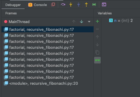 이렇게 n이 2일때까지는 꾸준히 함수스택이 쌓이다가 1이 되면 한번에 계산된다.