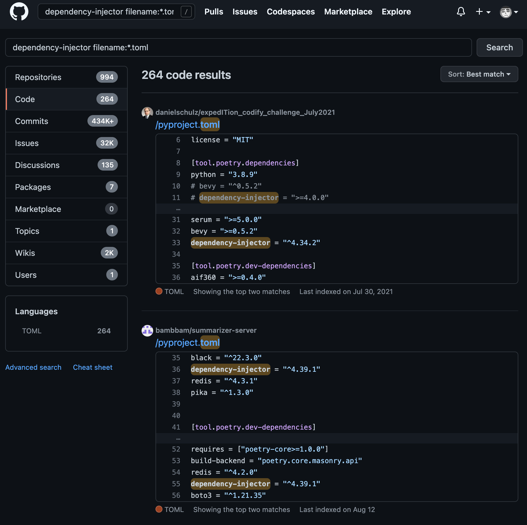dependency-injector filename:*.toml이렇게 검색을 하면 pyproject.toml에 dependency-injector가 poetry로 추가돼있는 프로젝트들을 찾아볼 수 있다. 정말 고맙게도 와일드카드를 지원해준다.