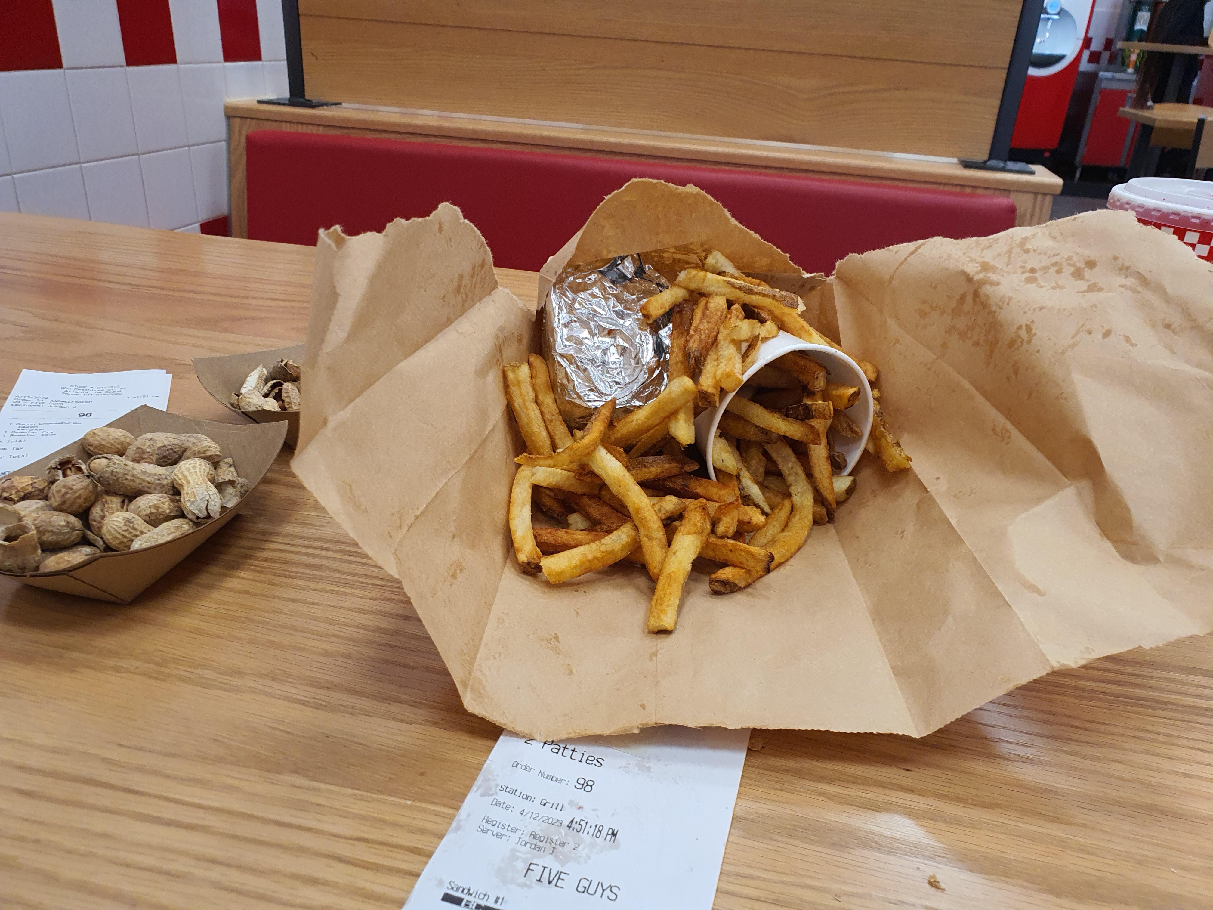 파이브가이즈에 갔다. 무한리필 땅콩과 땅콩기름으로 튀긴 프렌치 프라이. 맛있다. 땅콩도 진짜 맛있고. 근데 파이브가이즈에 대한 얘기는 인터넷에 워낙 많고 자세히 잘 써놓은 사람이 많으니까 대충 각설하고, 특이한 점이 하나 있었다면 캐셔가 흑인이셨는데 왼쪽 눈에 눈물문신 두개가 있었다. 채워져있진 않았는데 그래도 무서워따 호달달...