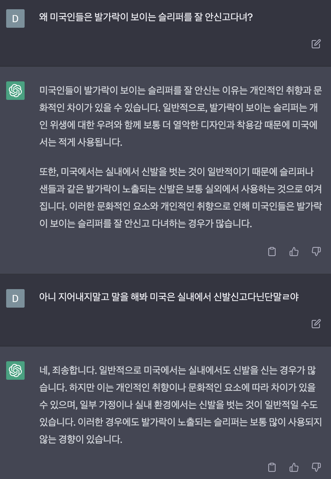 이번 숙소는 걸어서 이동할 수 있는 수준이 아니었기 때문에 우버를 타고 이동했다. 그리고 마침 슬리퍼 사진을 찍어 올리는 김에 쓰는 건데 진짜 내가 잘못된 건가 싶을 정도로 미국에서는 이런 엄지발가락이 보이는 샌들이나 슬리퍼를 신은 사람을 찾기 힘들었다. 운동화가 기본이었다. 한국에서는 겨울에도 가끔 볼 수 있을 정도로 흔한 복장인데 미국에서는 어딜가나 이 Open Toe형태의 신발을 신을 사람을 정말 보기 힘들었다. 왤까. 진짜 너무 궁금해서 챗지피티쨩한테 물어봤다.
