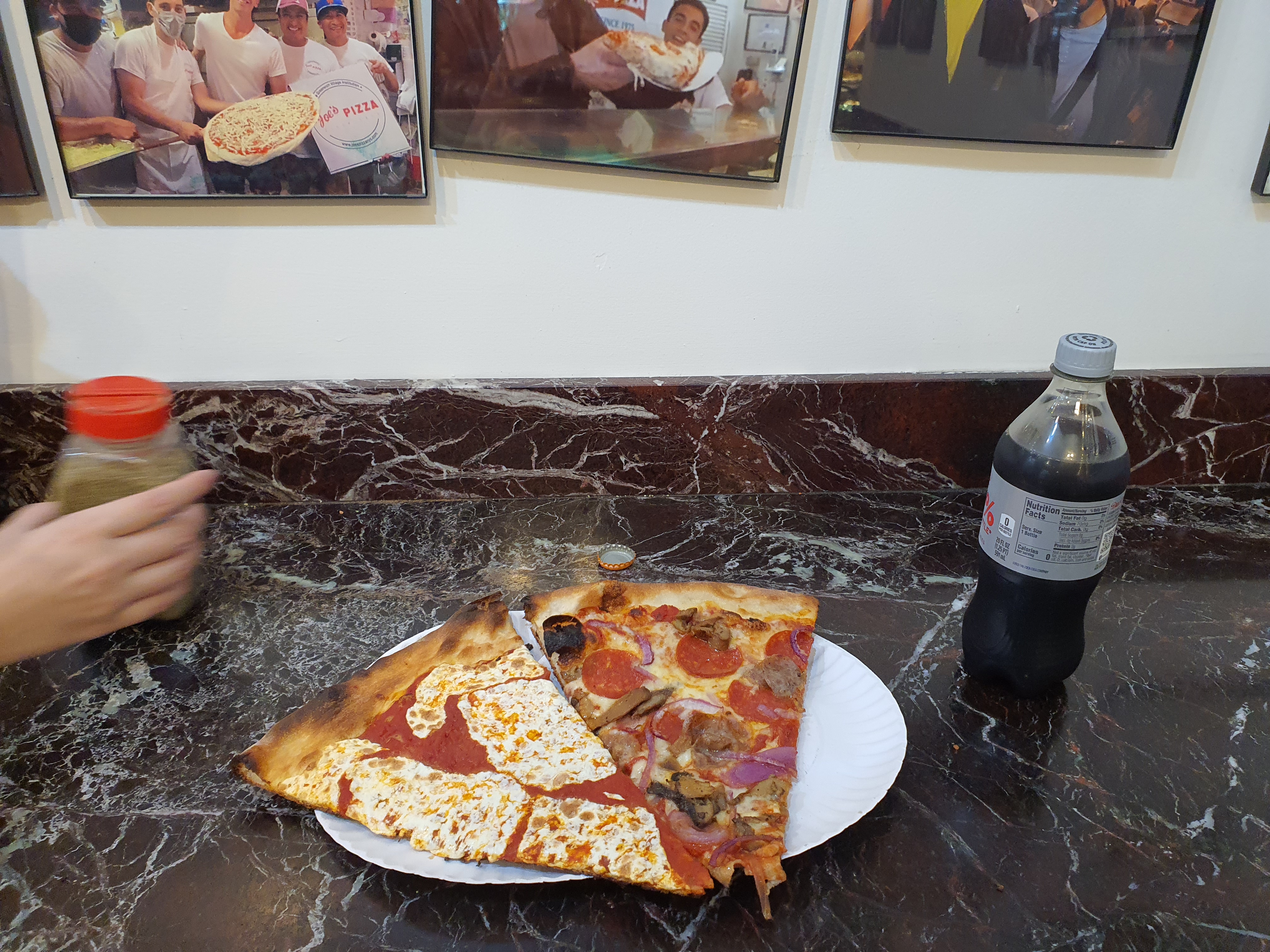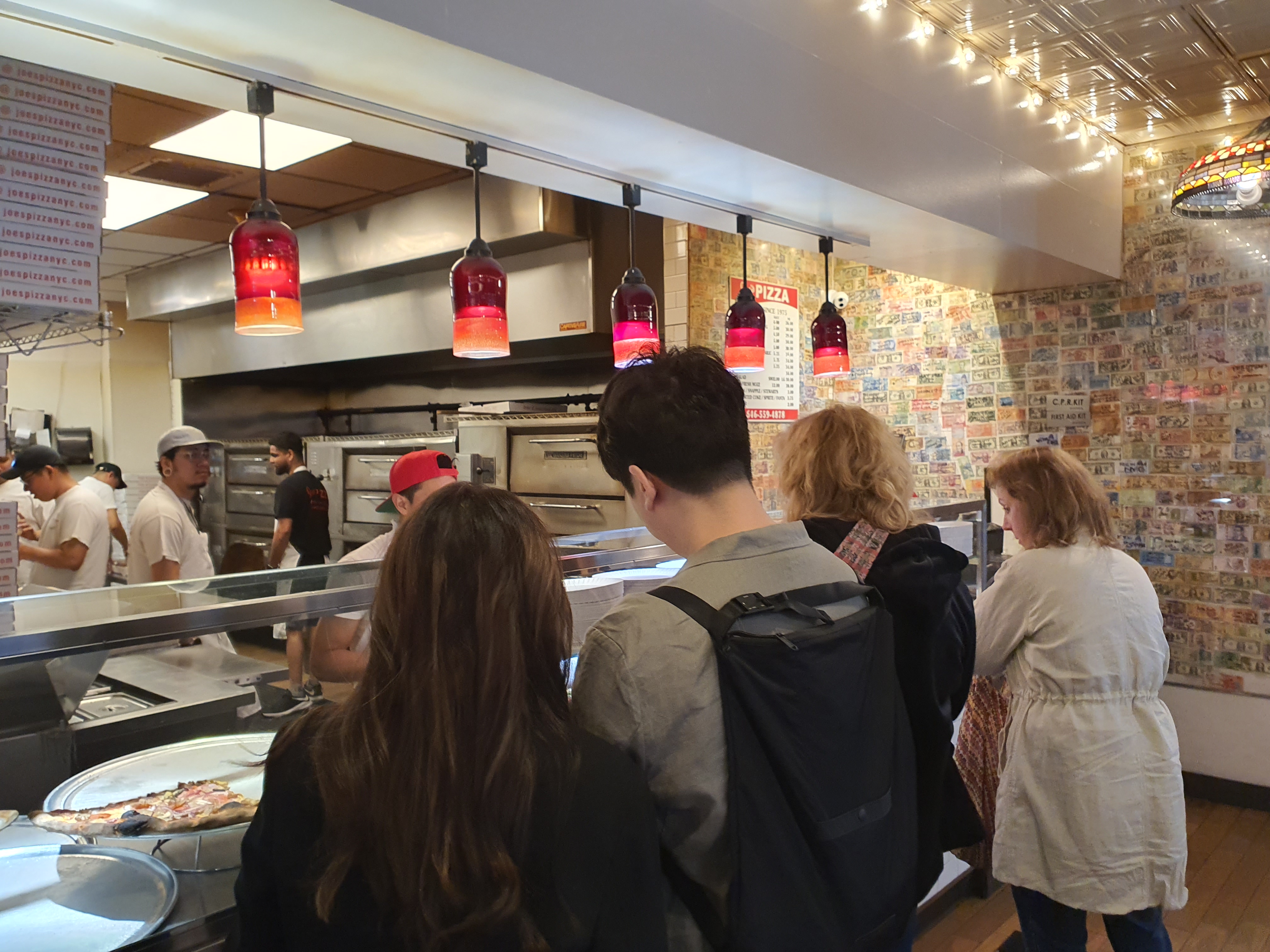 타임스 스퀘어에 다시 온 이유는 유명 피자집인 이 Joe's Pizza에 들리기 위함. 어제는 사람이 너무 많아서 못먹었다. 벽면에는 수많은 유명인사들이 들렸던 인증샷이 있다. 개중에는 코난 오브라이언처럼 이름도 아는 사람이 있고 얼굴만 아는 사람도 있고 뭐 아무튼 엄청 많았다. 근데 피자맛은 99센트피자가 훨씬 맛있었다. 왼쪽피자도 오른쪽피자도 너무 타서 그냥 빵이 부서질 정도로 바삭바삭하고 심지어는 탄맛이 나기도 했고 감칠맛 없이 짜고 탄맛만 났다. 차라리 숙소 옆에 있는 Chiara's가 훨배 낫다.