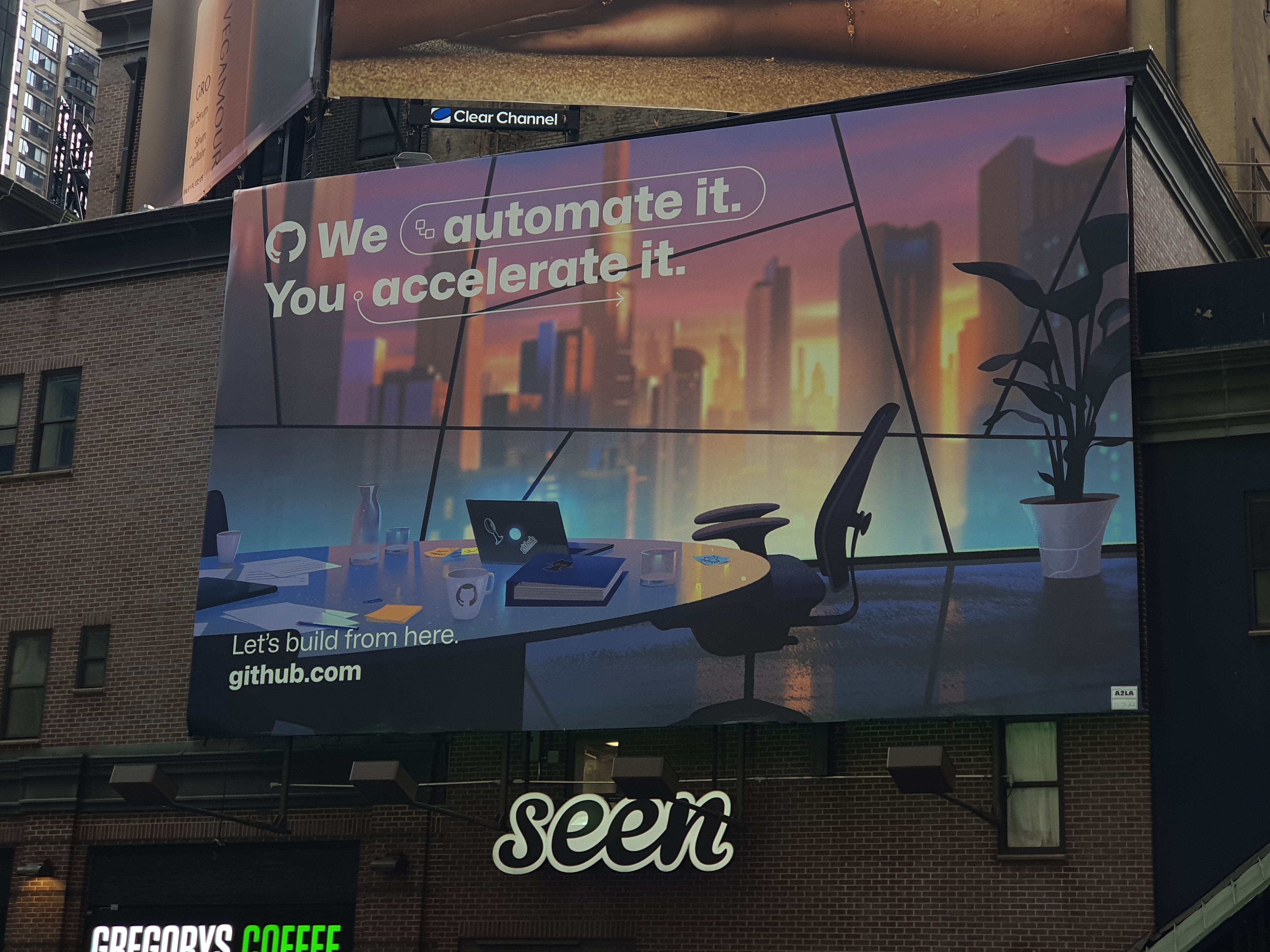 태어나서 처음 본 깃허브 광고. 그것도 오프라인... 덜덜. 타임스 스퀘어에서는 깃허브도 광고를 하는구나 싶었다. 그래서 기념으로 찰캌