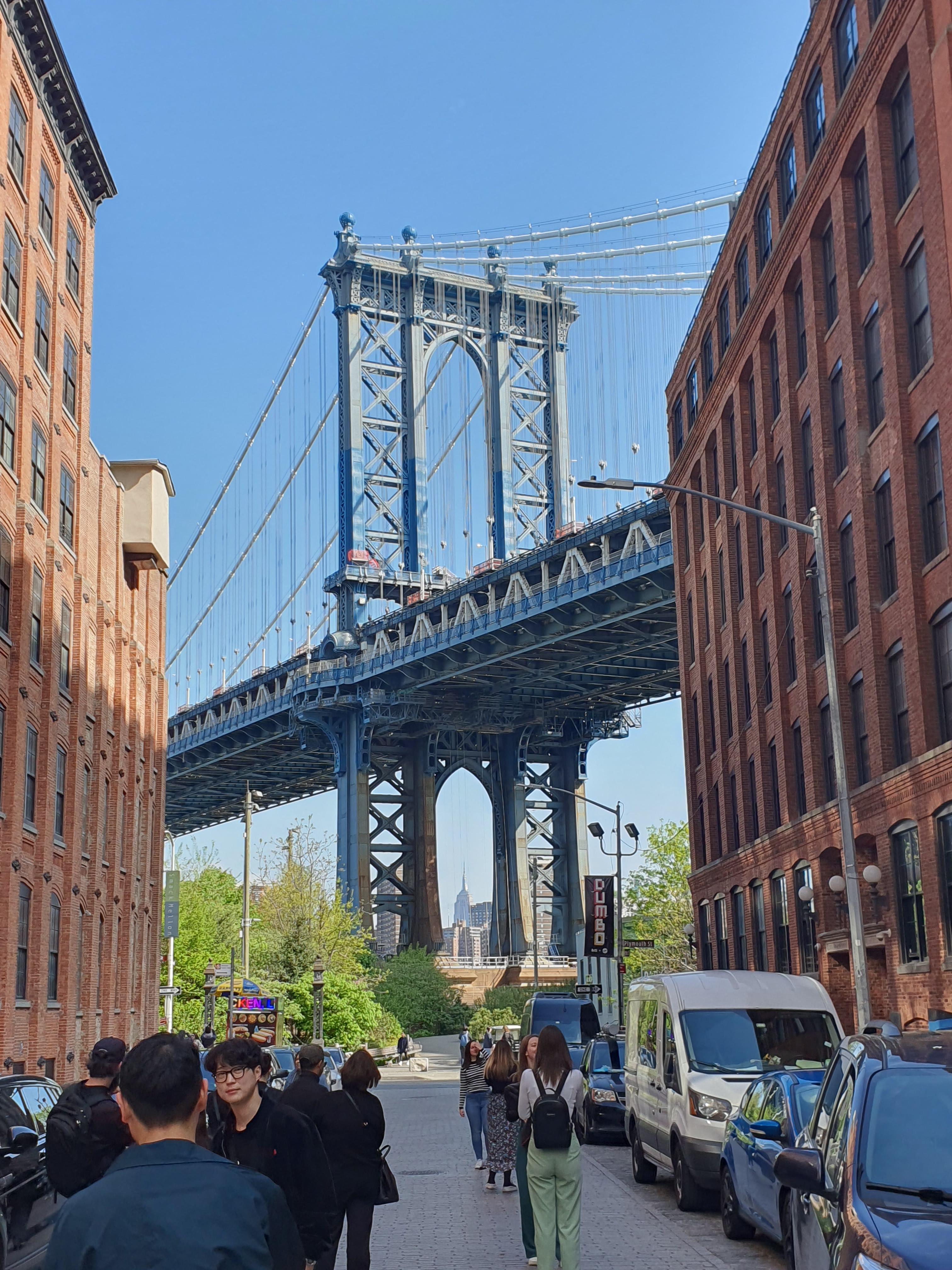 맨해튼과 브루클린을 잇는 브루클린 브릿지다. 많은 미디어에서 다뤄왔던 그곳인데 저 다리가 꽤 멀리 있음에도 굴구하고 너무나도 거대한 스케일 + 주거지역과 가까운 위치에 있어서 이런 멋진 모습을 연출한다. 실제로 봐도 멋지더라.