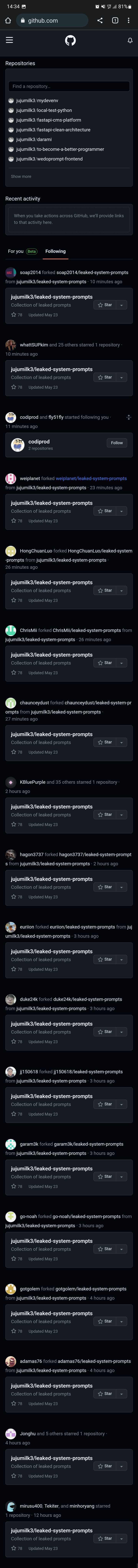 리포는 https://github.com/jujumilk3/leaked-system-prompts 이고 이름에서 알 수 있다시피 유출된 시스템 프롬프트들을 모아놓은 레포지토리이다. 요즘 LLM관련해서 관심도 많이 생기고, 사내에서도 관련 시스템에 같이 작업할 기회도 생기고 해서 프롬프트를 잘 짜는 것이 얼마나 중요한 일인지 많이 깨닫는 계기가 됐는데 회사 동료분이 유출된 시스템 프롬프트를 모아둔 블로그 페이지를 알려주셨고 깃헙에는 아직 없는 걸 발견해서 여기에다가 싹 정리를 해놨던게 발단이었다.